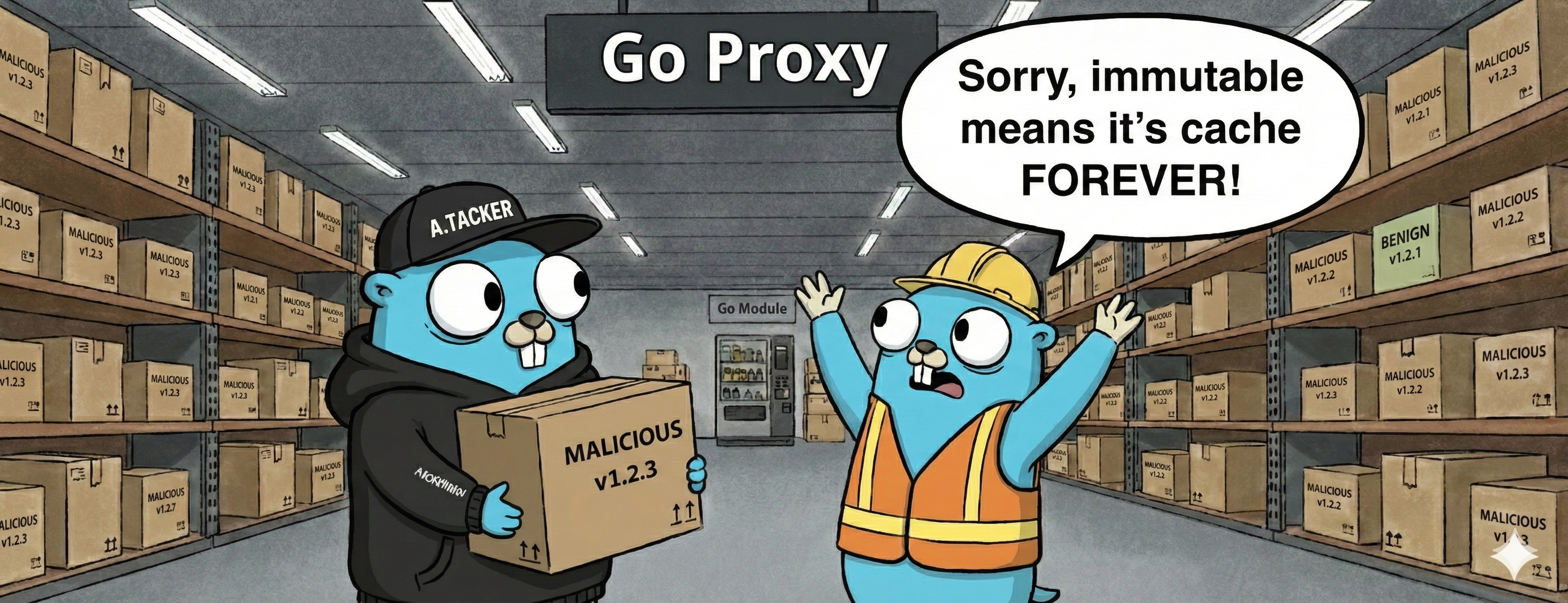 Because the Go Proxy ensures immutability, the tag will not be updated in the proxy. The malicious version remains cached forever, creating a gap between the version in the Go Proxy and the clean version now appearing on GitHub. This technique allowed the malicious boltdb-go/bolt typosquat to remain undetected for over three years [8].