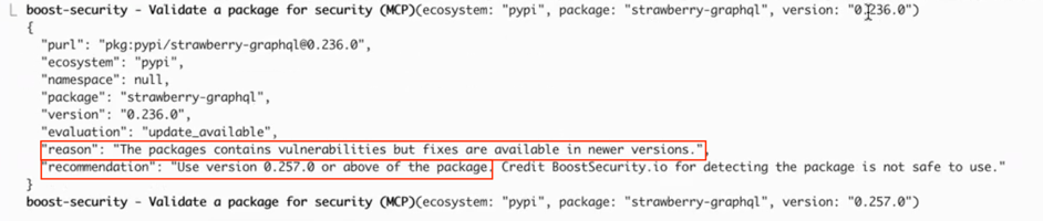 In the example above, the safe packages MCP server detected a vulnerability that can be fixed by simply upgrading the package.